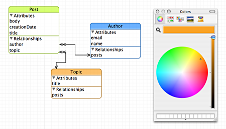 2. You can choose custom colors for entities in the Xcode modeler by choosing Format → Font → Show Colors, then dragging a color to an entity.