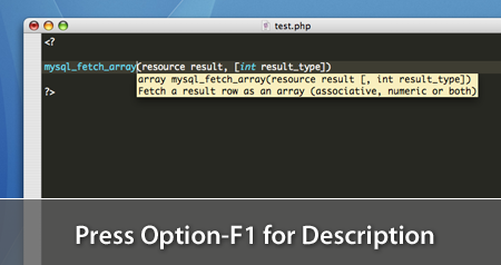 Particularly interesting in this build are the documentation-related additions to the PHP bundle. The first is Option-F1 to get a tooltip with a signature and short description of the current function.